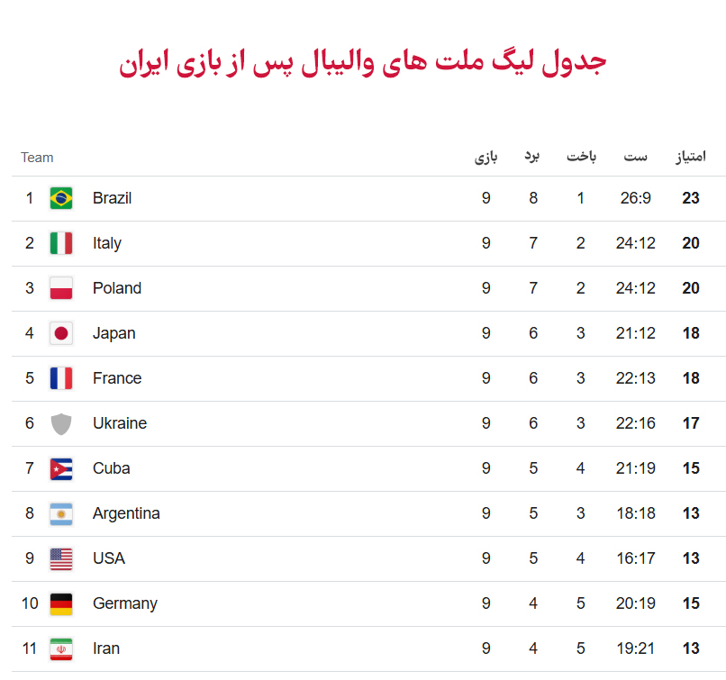 به گزارش تجارت نیوز، والیبال ایران فعلا در رده ۱۱ جدول لیگ ملت های والیبال قرار دارد.