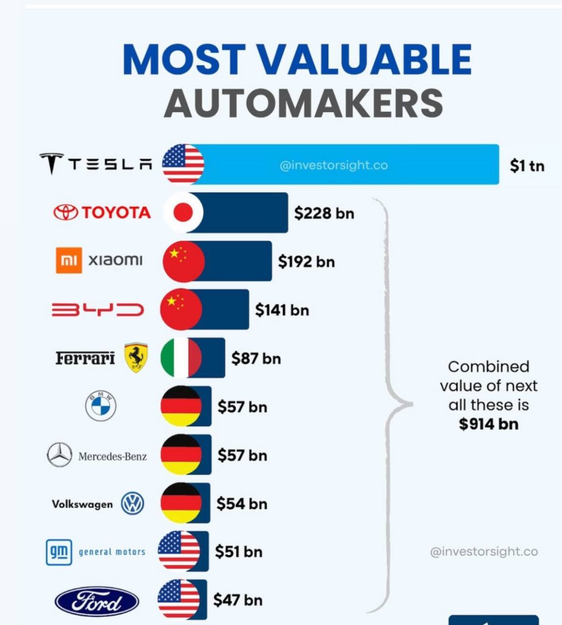 در سال ۲۰۲۴، تسلا با ارزش بازار ۶۳۶.۷۹ میلیارد دلار در صدر قرار دارد/تویوتا با ۳۰۶.۹۶ میلیارد دلار در رتبه دوم و پورشه با ۷۸.۳۴ میلیارد دلار در رتبه سوم قرار دارد/مرسدس بنز نیز با ۷۷.۸۴ میلیارد دلار در رتبه چهارم قرار دارد.