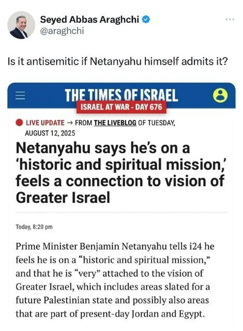 سید عباس عراقچی، با اشاره به اظهارات «بنیامین نتانیاهو» مبنی بر علاقه وی به دیدگاه «اسراییل بزرگ» در حالی که رسانههای غربی معمولاً هر کسی را که به ایده «اسرائیل بزرگ» صهیونیستها اشاره کند متهم به «یهودیستیزی» میکنند، نوشت: آیا اگر نتانیاهو خودش اعتراف کند باز هم یهودیستیزی است؟
