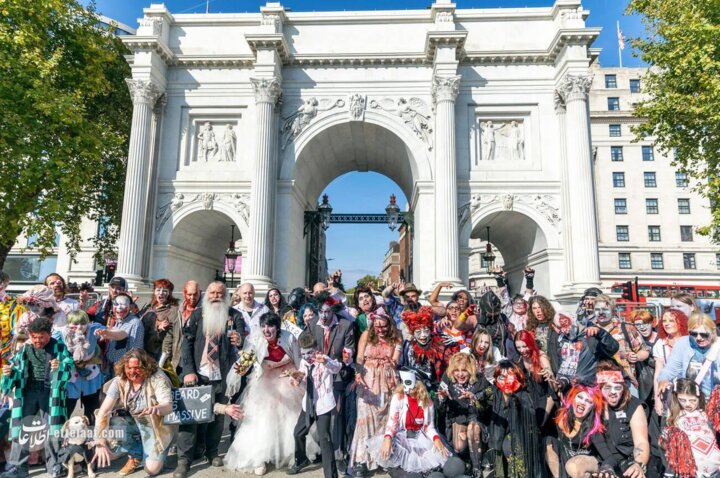 جشنهای زامبی در کشورهای مختلف از سوی طرفداران فیلمهای ترسناک برگزار میشود. در لندن این جشن با کازپلی (لباسپوشی به سبک شخصیتهای خاص) همراه میشود و هر سال تصاویر جالبی ایجاد میکند.