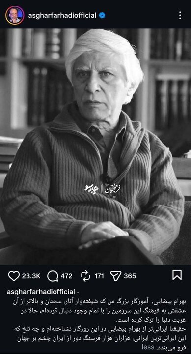واکنش چهره ها به درگذشت بهرام بیضایی | اصغر فرهادی، شفیعی کدکنی،نیکی کریمی و….