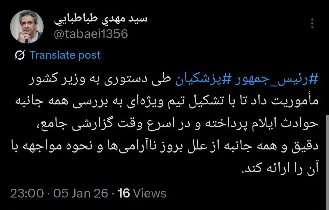 معاون ارتباطات و اطلاع‌رسانی دفتر رئیس‌جمهور نوشت: رئیس‌جمهور ‎پزشکیان طی دستوری به وزیر کشور مأموریت داد تا با تشکیل تیم ویژه‌ای به بررسی همه جانبه حوادث ایلام پرداخته و در اسرع وقت گزارشی جامع، دقیق و همه جانبه از علل بروز ناآرامی‌ها و نحوه مواجهه با آن را ارائه کند.