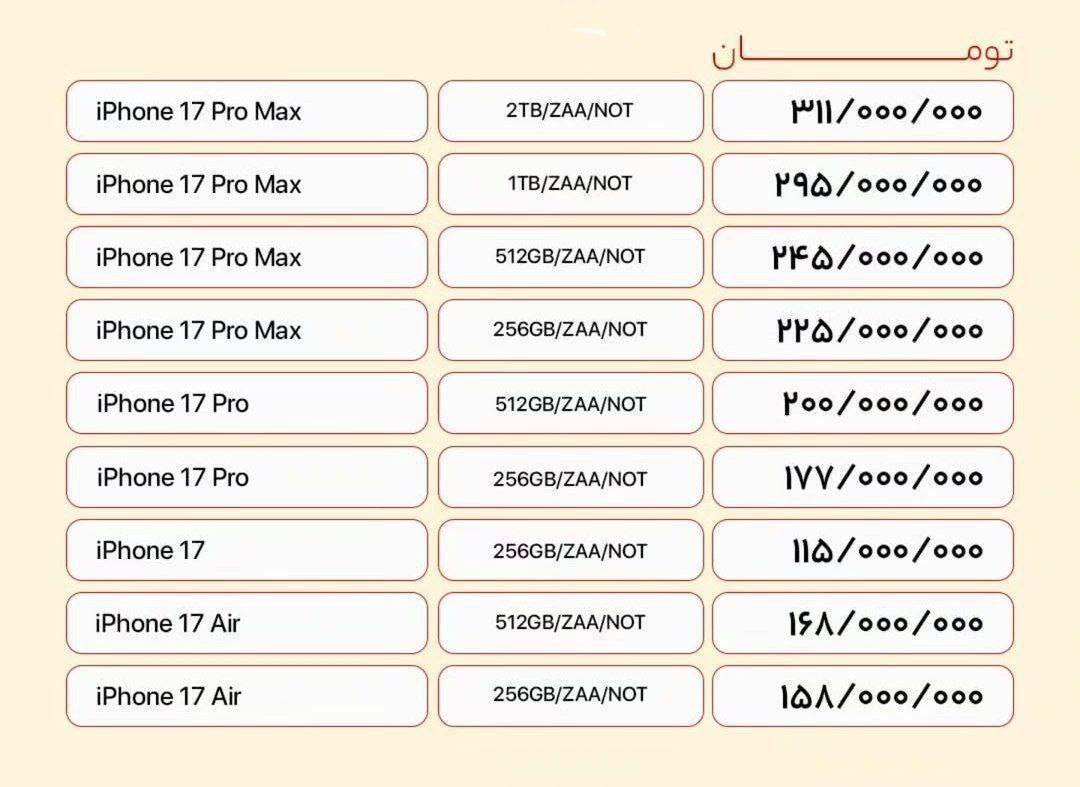 فرارو: پرچمدار جدید اپل در بازار با قیمت نجومی ۲۵۰ میلیون تومان فروخته میشوند قیمت آیفون 17 پرومکس با فضای ذخیرهسازی 256 گیگابایت امروز یکشنبه 27 مهر در بازار موبایل...